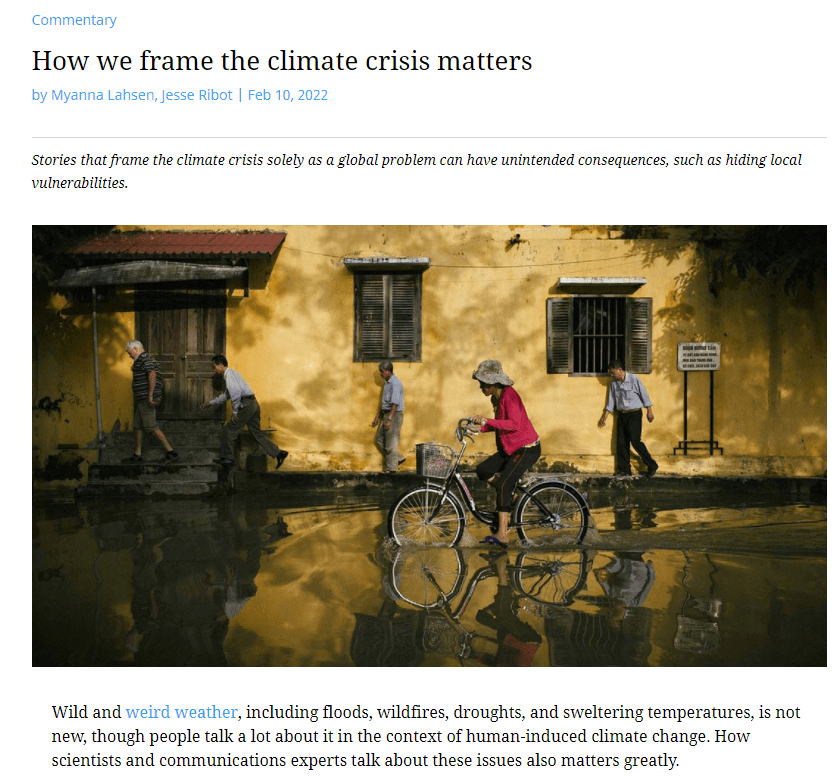 Article by Myanna Lahsen and Jesse Ribot. Download here: Politics of Attributing Extreme Events and Disasters to Climate Change