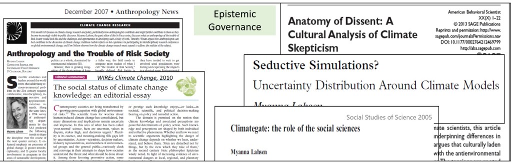 Lahsen,M. 2007.“Trust through participation? Problems of knowledge in climate decision making.” Book chapter in The Social Construction of Climate Change: Power, Knowledge, Norms, Discourses, edited by Mary Pettinger. Ashgate Publishing, 2007.